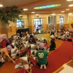 防災頭巾をかぶって大ホールと虹のホールに避難しました。