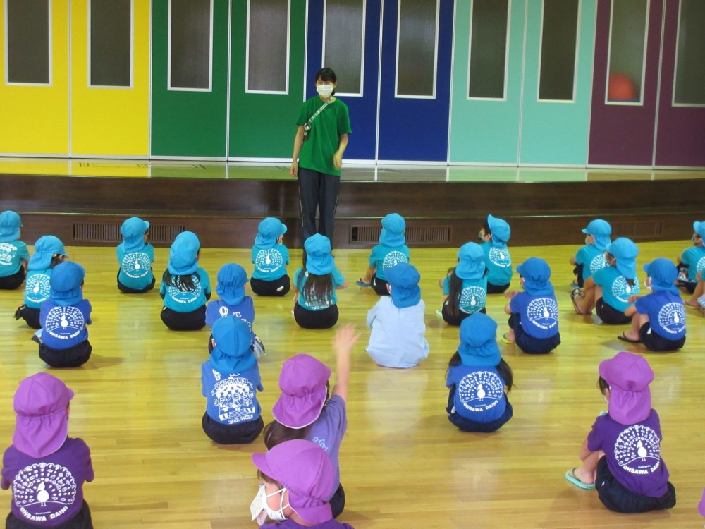 今日はかっこいい年長さんの姿ってどんな姿なのか先生たちの寸劇を見ながら