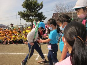 一人ひとりが一生懸命、竹馬のバトンを渡す姿は真剣で