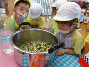 年少々組のお友だちが幼稚園の畑で育てたピーマンを使って夏野菜カレーのクッキングをしました!