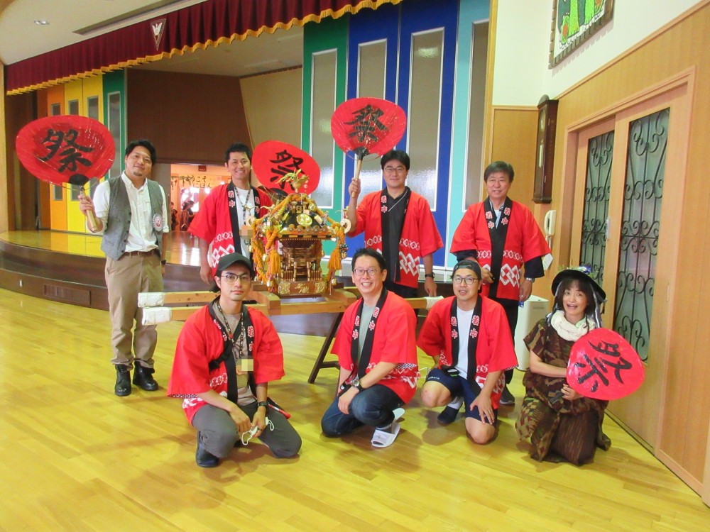 お父さんたちも頑張ってくれました。お神輿を担いで「わっしょいわっしょい!!」