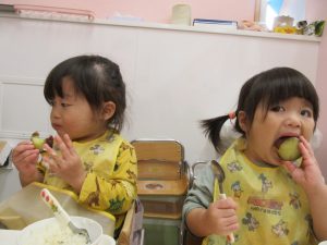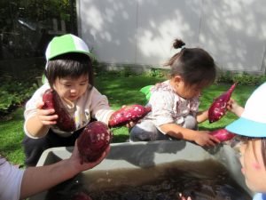 年中組にもらったお芋を自分たちで洗ってふかし芋にしていただきました。