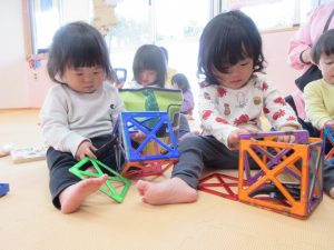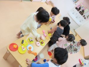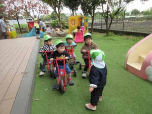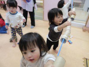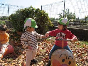 ままごとやブロック、洗濯干しのコーナー遊びを楽しんだり、アンパンマン広場では段ボールを広げたり、電車ごっこ、三輪車も大好きな遊びです♪