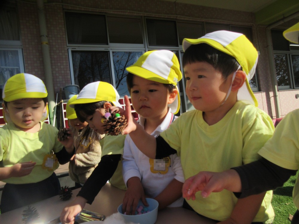 園庭でどんぐりをみつけると「みーつけた!」と袋いっぱいに集めたり、「おふとんみたい~」と落ち葉に寝転がったりとたくさんの自然に触れあいながら遊んでいます!