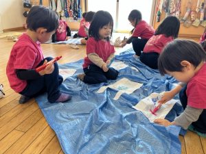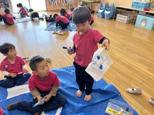 ビニール袋に好きな模様を描くと、オリジナルの凧が完成★