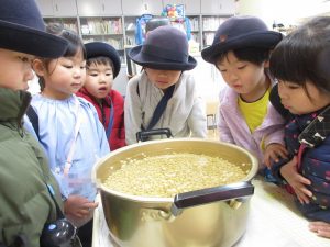 先生たちが朝早くから、大豆を茹でてくれていました!