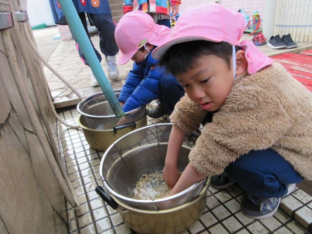 「何かムニュムニュする!」「豆の形がなくなってきた!」