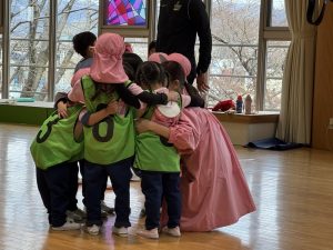 試合が始まるとボールに向かって一生懸命走り、転んでも立ち上がりガッツを見せていました。キーパーもドキドキ♡「全体入れさせない!」と真剣な表情でゴールを守る姿が見られました!