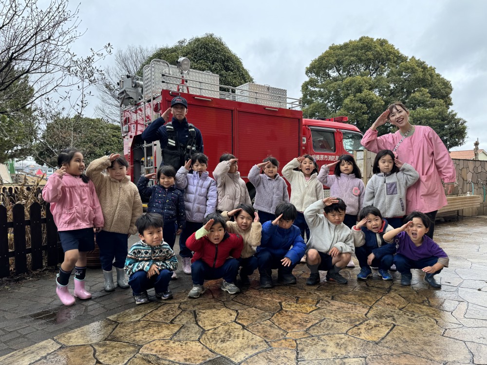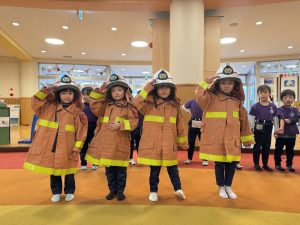 年長組は子ども用の防火服を着て敬礼!気分は消防士!
