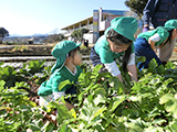 土に触れ、種や苗から自分たちで育てた野菜を収穫する喜びは食べる喜び、感謝へ繋がります。畑から収穫した野菜の美味しいこと、格別な味を舌が覚える瞬間です。育てた野菜を使ってお料理にも挑戦。自分たちで作る味噌汁はみんなの大好物です。園内の田んぼでは年長組がお米作りもします。稲作体験はお米1粒1粒を大切に食べる子どもを育てます。生きる力に繋がる〝食育″に力を注いでいます。